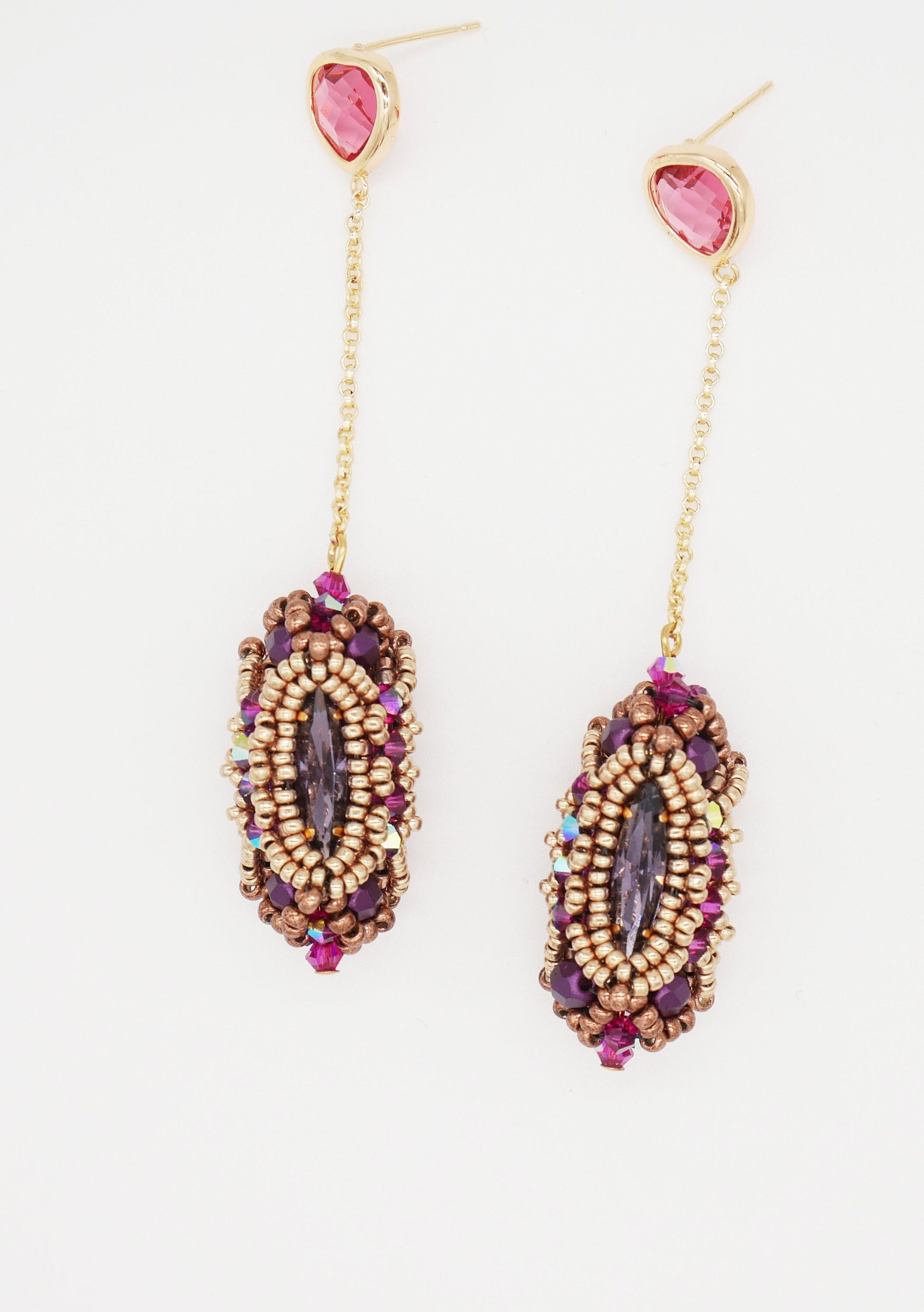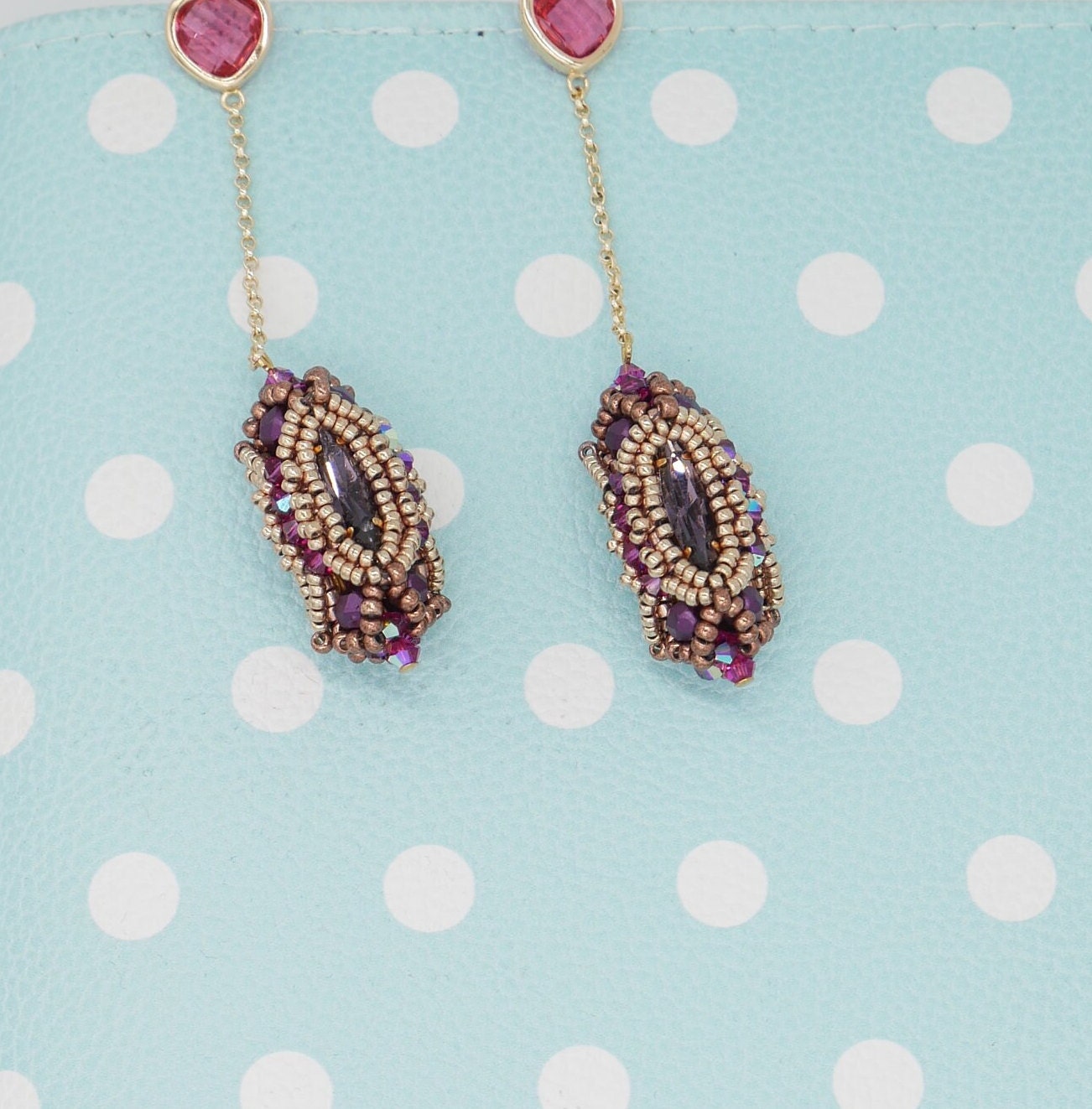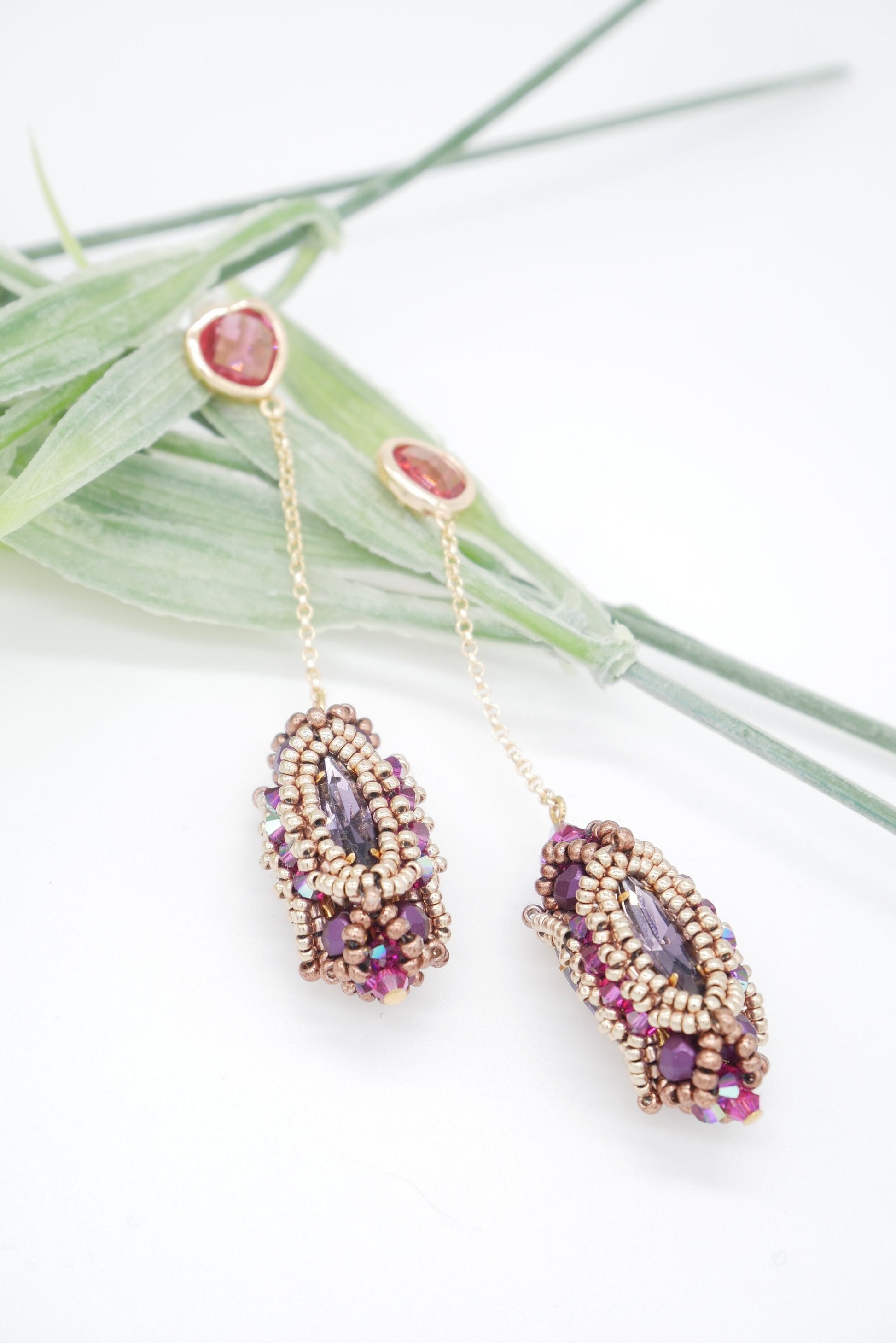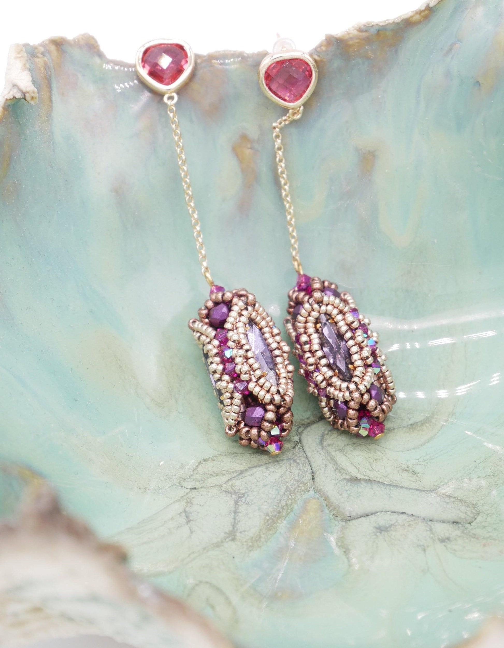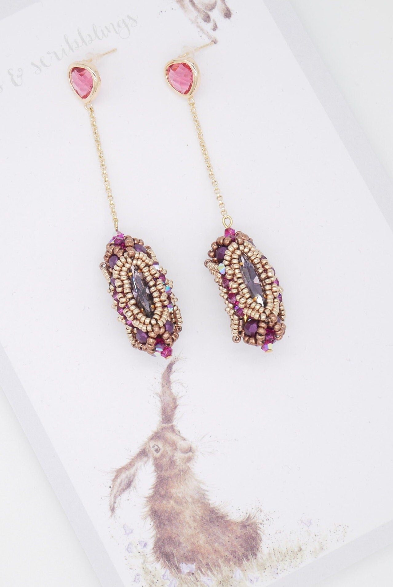 These stunning crystal encrusted beaded bead earrings start with a square stitch bezel before embellishing with layers of beads for a sturdy, yet stunning finish. Tutorial would be described as intermediate.